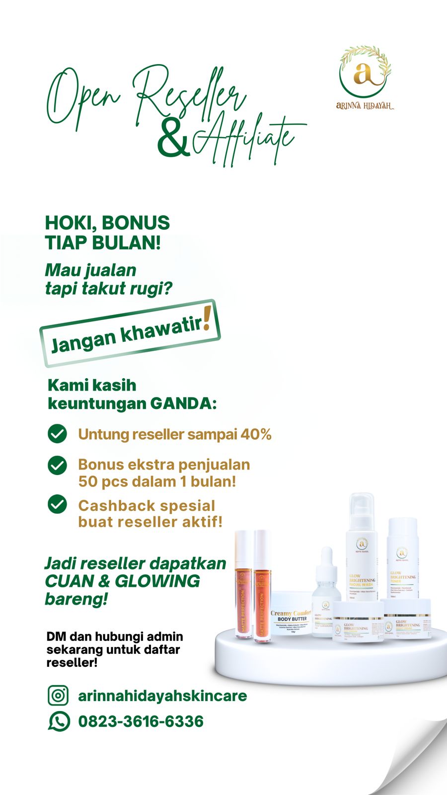 “Jangan lewatkan kesempatan ini untuk mendapatkan CUAN & GLOWING bareng Arinna Hidayah Skincare. Mulai usahamu sekarang dan raih keuntungan tanpa batas!,” pungkasnya.